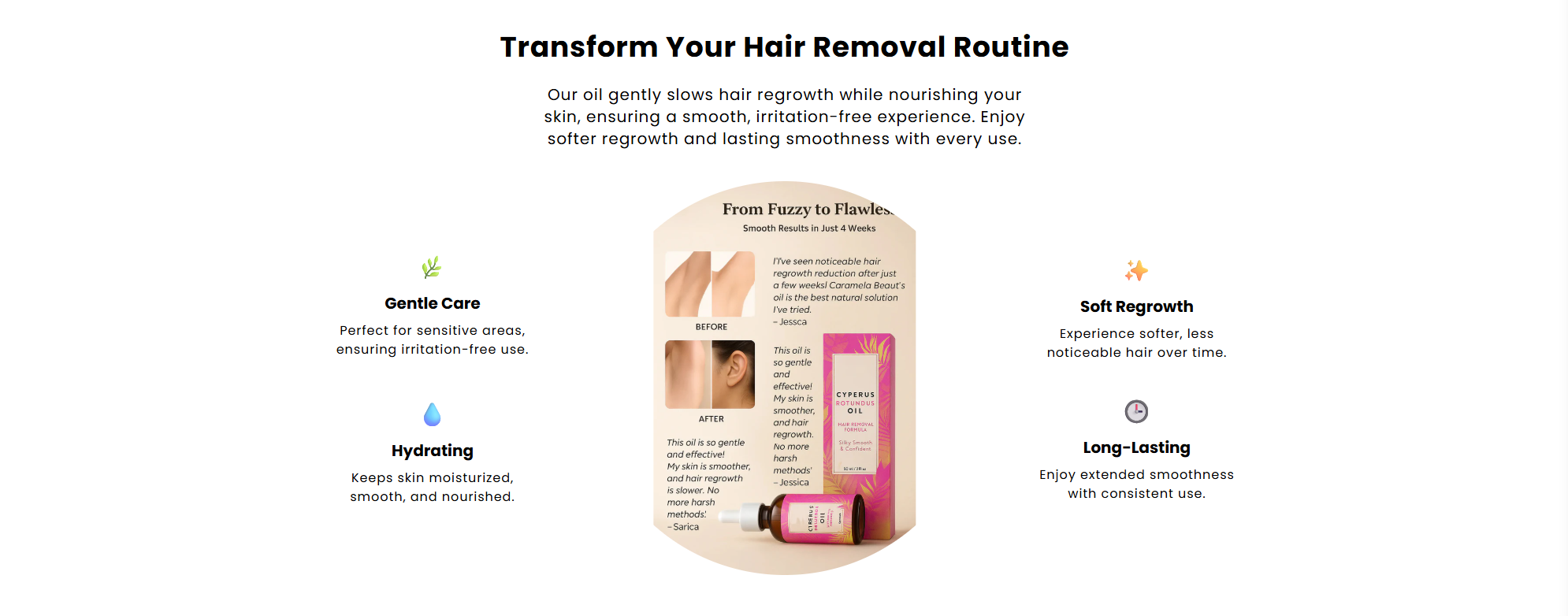 Unlike others, our oil works gently at the root, naturally slowing regrowth while hydrating skin. Enjoy smooth, irritation-free results with every application.