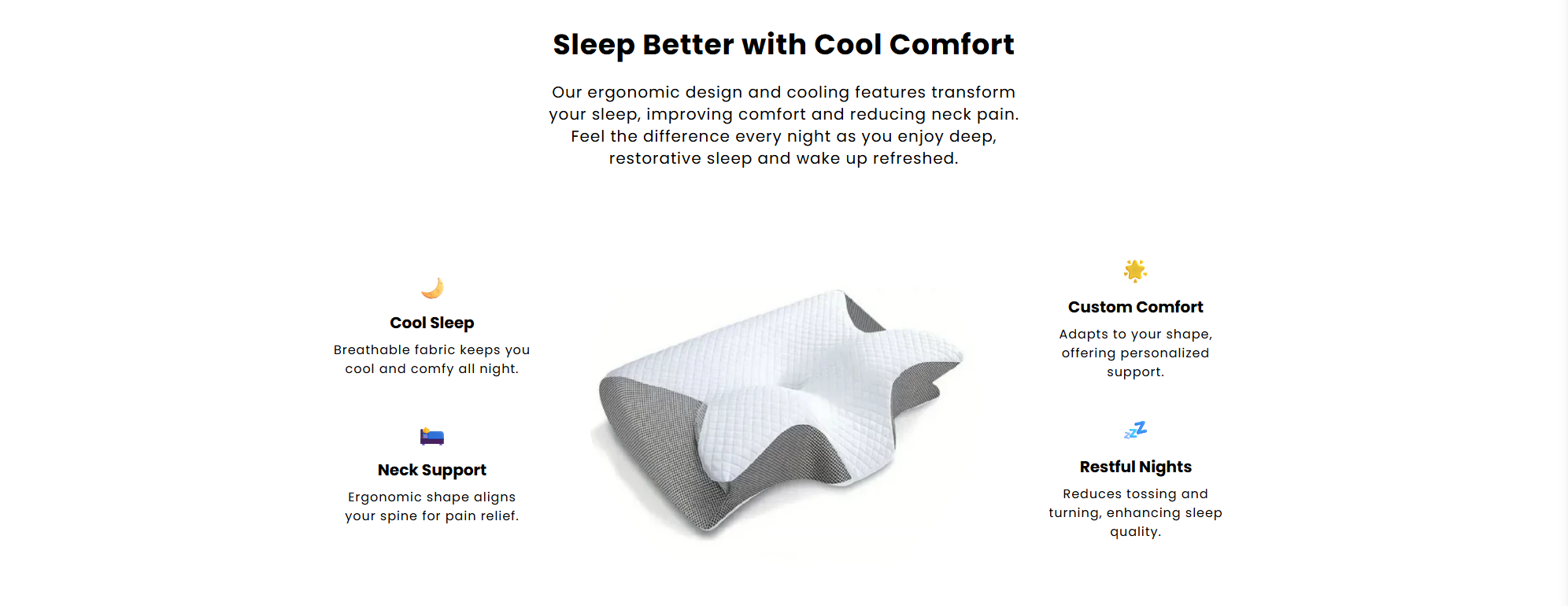 Imagine waking up without neck pain or stiffness. Our pillow's ergonomic design supports your spine, providing relief and comfort. Say goodbye to restless nights and hello to energized mornings with improved sleep quality.
